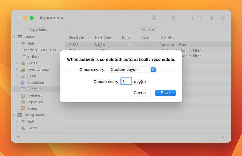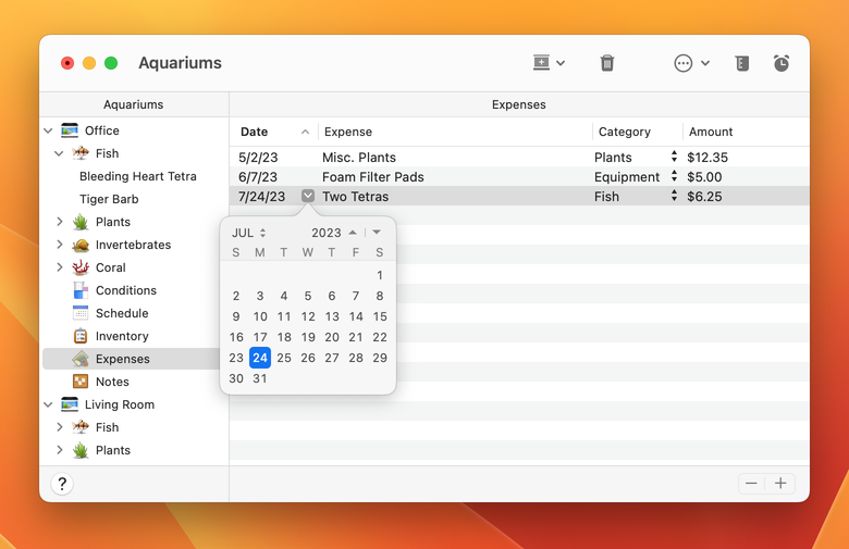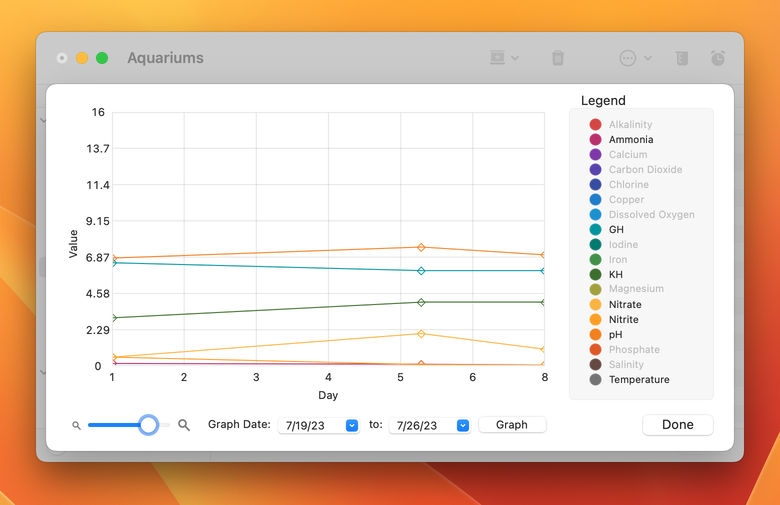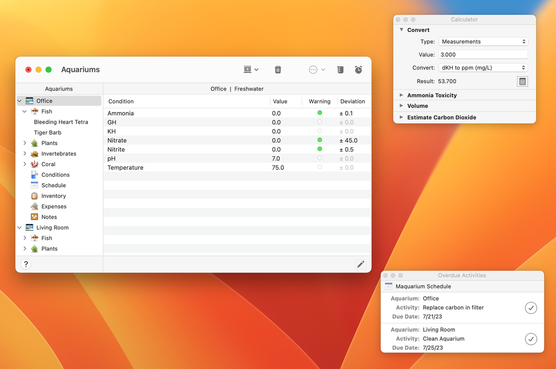 Maquarium allows users to track up to 17 chemicals and tank conditions, schedule tasks, keep notes, set warning alerts, analyze expenses and manage the inventory of multiple freshwater and saltwater aquariums.