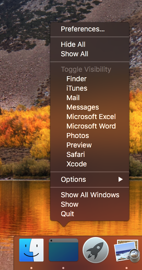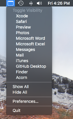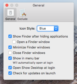Show Desktop is a small macOS application that will hide all applications for an unobstructed view of your desktop. It can run in the menu bar or the Dock. The right-click menu shows all applications for quick access. Lastly, it can be configured for precise control over what you want shown or hidden.
